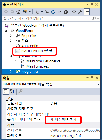 속성에서 출력 디렉터리에 복사 값을 '새 버전이면 복사' 로 변경